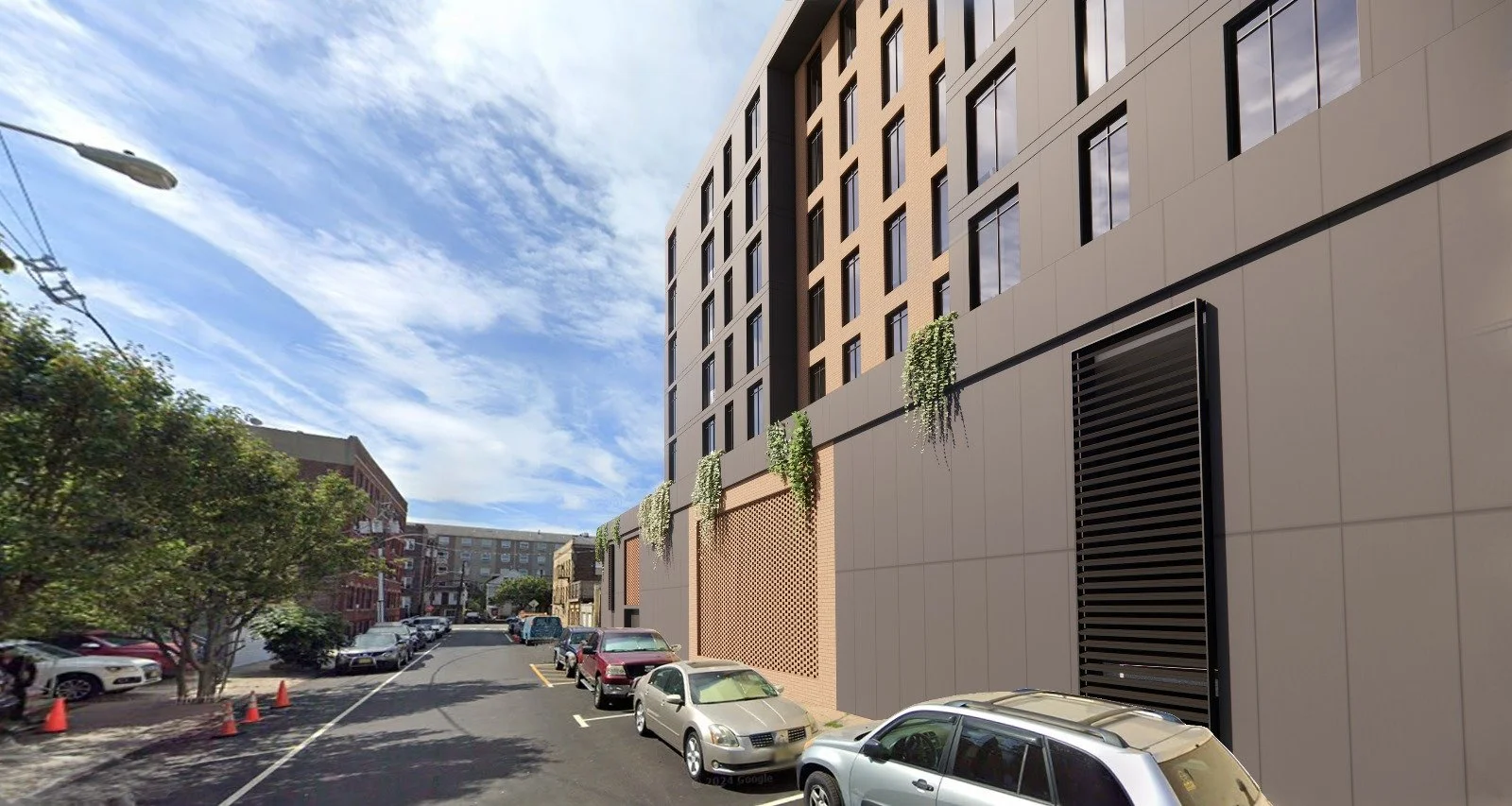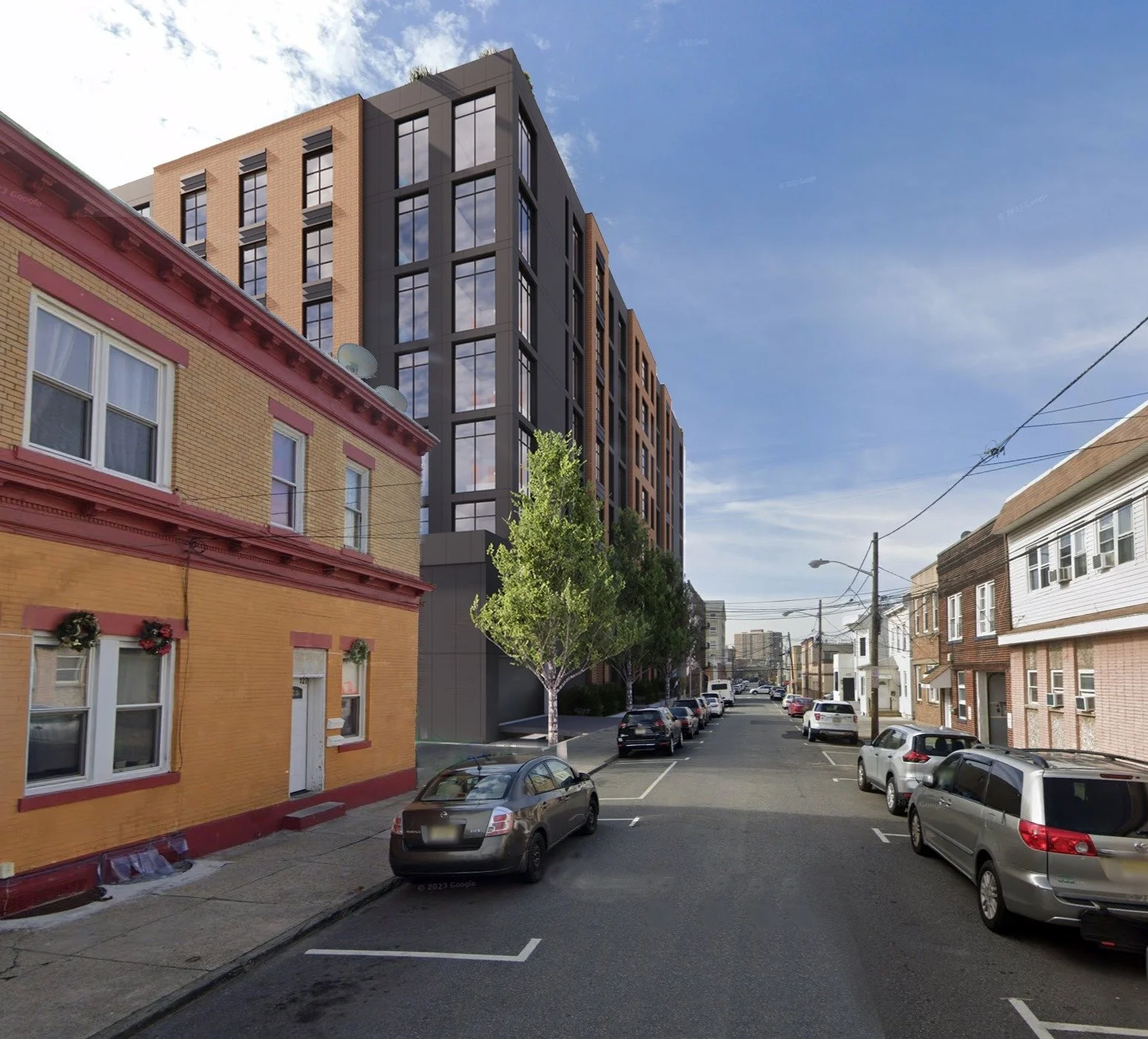 This New Jersey multifamily building creates a warm and sophisticated urban presence, anchored by a rich material palette that contrasts textured, tan-colored brick with sleek, dark metal panels. The facade is thoughtfully detailed with sections of perforated brick screening, adding an intricate, modern texture that filters light and animates the surface. A prominent dark canopy projects over the ground floor, clearly defining the residential entry and providing a human-scaled element that engages the streetscape. The design's strong, orderly rhythm of large, deeply set windows completes this contemporary composition, balancing residential comfort with a refined, durable aesthetic.